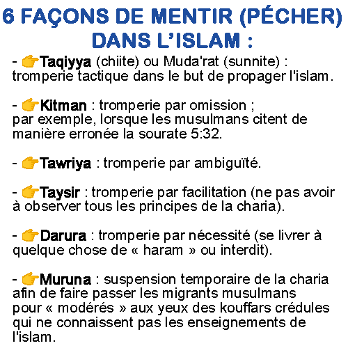 Un travail de fond a été opéré depuis plus de 50 ans qui a fait en sorte que l’Occident devienne laïque, c’est-à-dire anti-dieu : il en résulte un grand remplacement de toutes nos valeurs, croyances, coutumes chrétiennes, etc. par la programmation sans Dieu des mondialo-talmudo-satanistes. Mais un autre « grand remplacement », sur la forme celui-là, est voulu par ceux-ci. Si leur agenda s’était réalisé, s’il n’y avait pas d’Alliance militaire pour exterminer ces monstres sur le plan terrestre et les Forces de la Lumière pour anéantir les Forces de l’Ombre sur le plan spirituel, la république satanique anti-dieu que nous verrions apparaître serait à l’image de ce que les islamistes ont commencé à instaurer avec au final la charia, le hijab pour toutes les femmes, la légitimation du djihad, la légitimation du mariage à partir d’âge de 9 ans (la pédophilie, donc), la persécution des chrétiens et des juifs, etc.