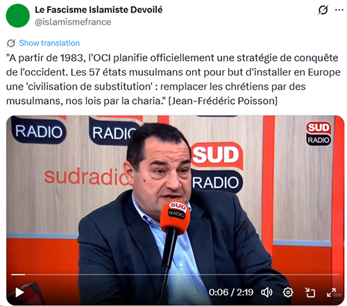 « A partir de 1983, l’OCI planifie officiellement une stratégie de conquête de l’occident. Les 57 états musulmans ont pour but d’installer en Europe une ‘civilisation de substitution’ : remplacer les chrétiens par des musulmans, nos lois par la charia. » [Jean-Frédéric Poisson, homme politique français]