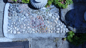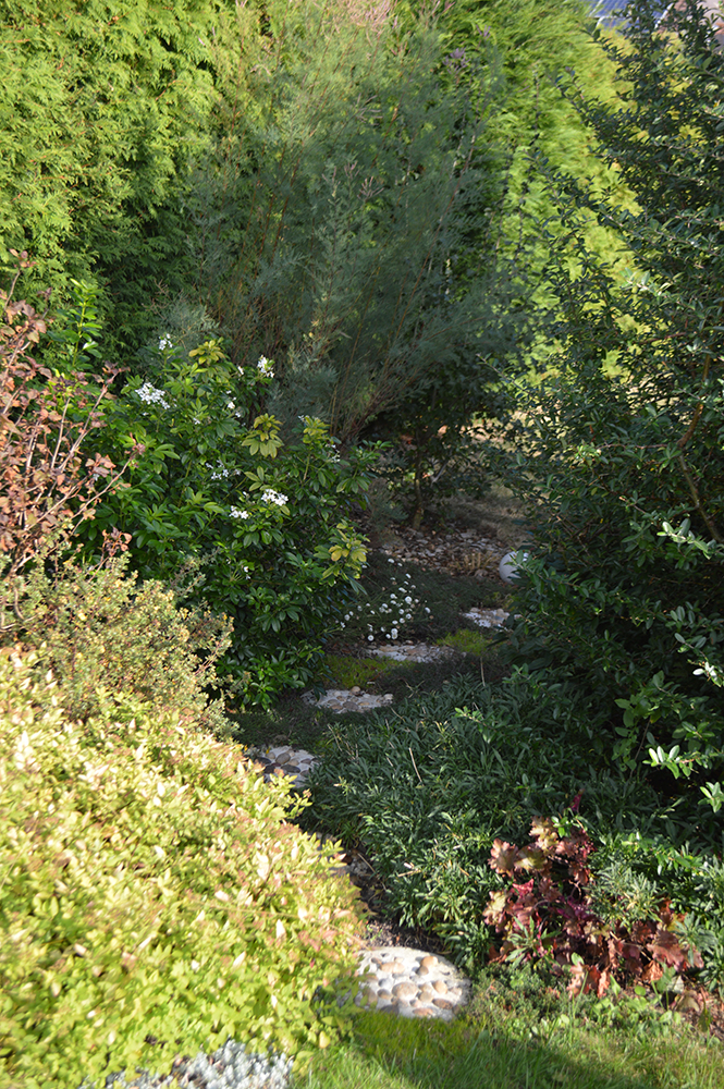 Enfin, j’ai aussi réalisé deux chemins de pas japonais à travers le jardin : des dalles rondes rehaussées de galets colorés qui guident maintenant les pas entre les massifs comme une invitation à flâner.