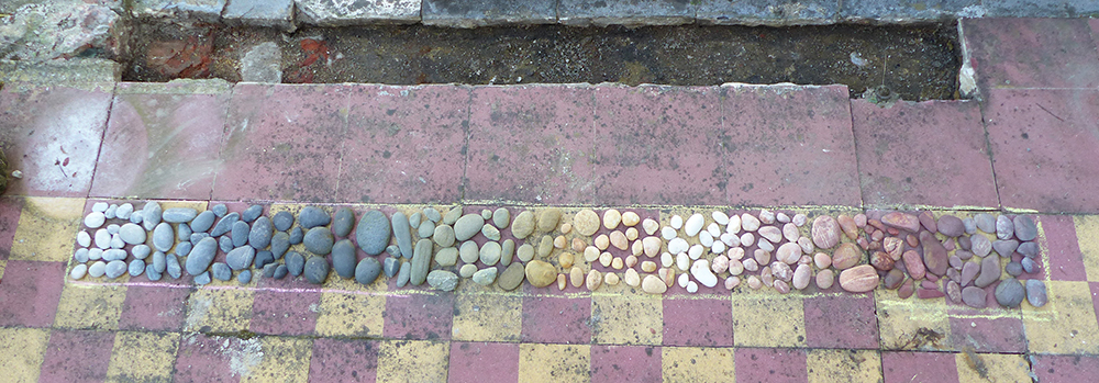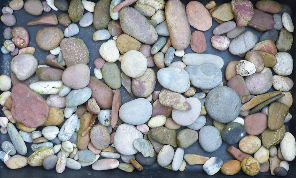 Chaque été, au retour des vacances, je rapporte dans mes valises des kilos de galets ramassés sur les plages d’Europe : des gris perle, des ocres brûlés, des verts d’eau, des blancs laiteux,… tous les formats, toutes les nuances.