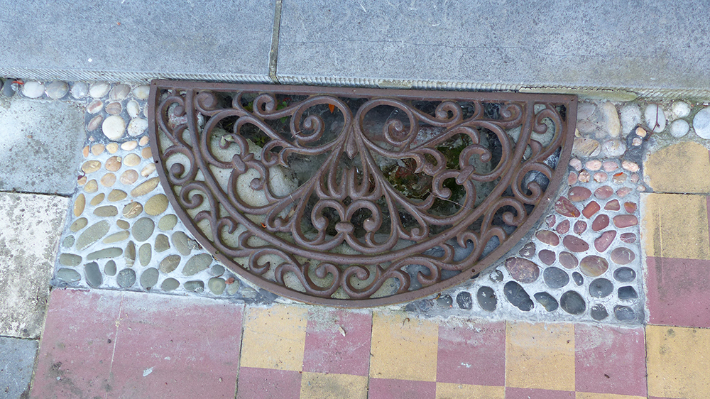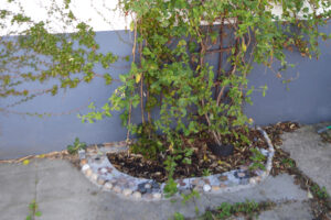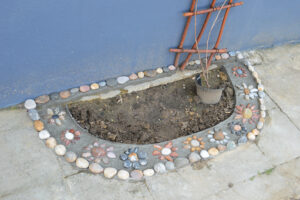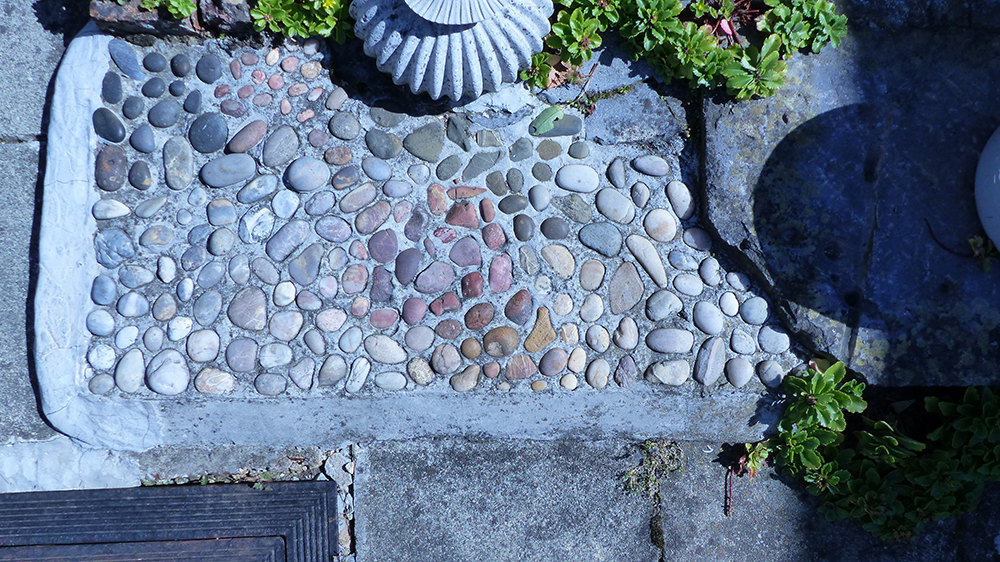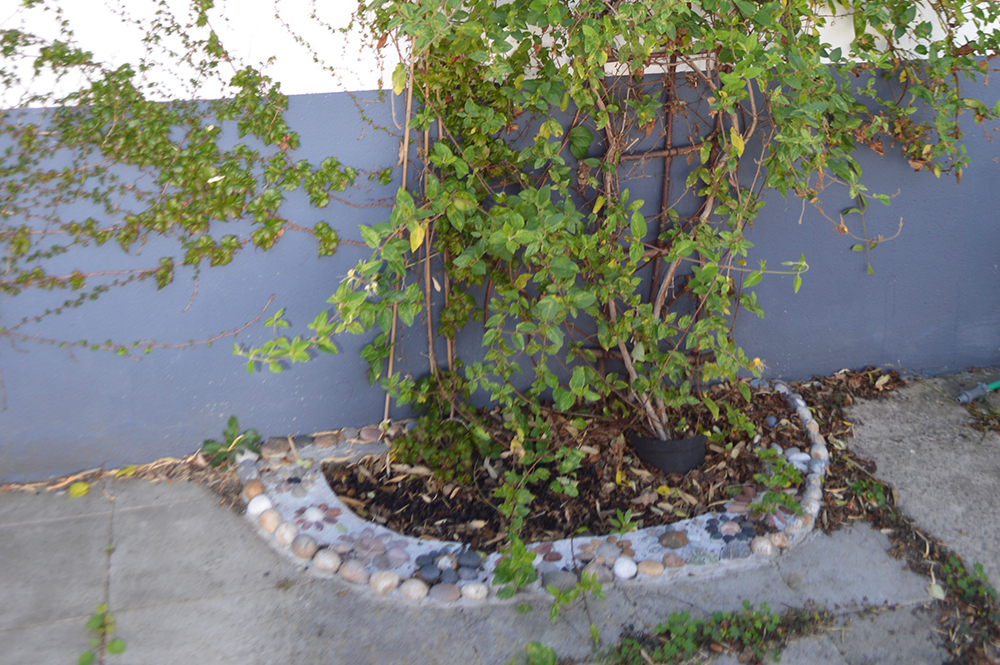 Un peu plus loin, Joaquim a découpé dans les dalles une demi-lune pour y accueillir des plantes grimpantes. J’en ai profité pour en souligner le contour d’une guirlande de galets disposés comme des pétales.