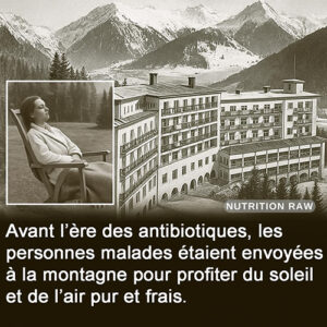 Avant que les Rockefeller ne prennent le contrôle total de la santé dans le monde en imposant leurs poisons chimiques (Big Pharma nous tue), et ce, après avoir traité de charlatanisme puis éliminé certains remèdes et thérapies naturels et ancestraux et en avoir pénalisé d’autres, les personnes malades étaient envoyées à la montagne pour profiter du soleil et de l’air pur et frais. Certains hôpitaux avaient une terrasse au soleil, notamment pour le traitement de la tuberculose.